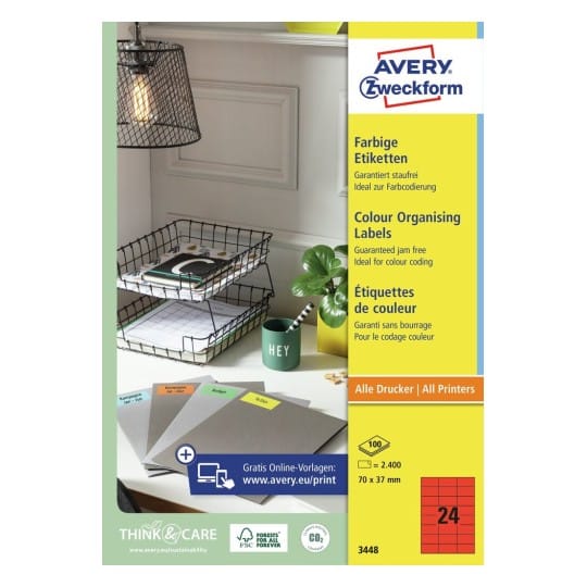 Czerwone, trwale przylegające etykiety samoprzylepne 3448 w formacie 70×37 mm od AVERY ZWECKFORM doskonale nadają się np. do oznaczania kolorami dokumentów. 2400 etykiet na 100 arkuszach w opakowaniu. Gwarantowany druk etykiet bez zacięć oraz bez pozostałości kleju w drukarce.