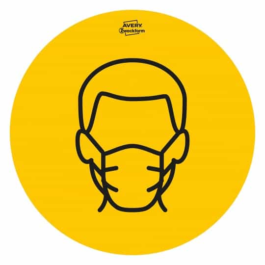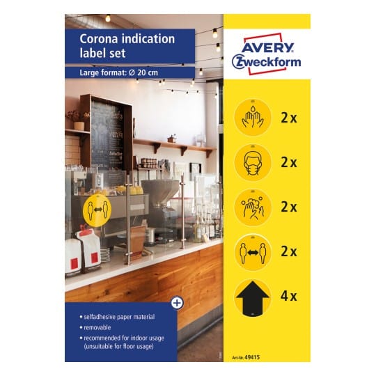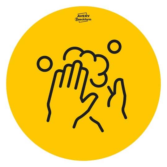 Samoprzylepne, usuwalne, papierowe etykiety Avery Zweckform Idealne do użytku w pomieszczeniach użyteczności publicznej np. sklepach, kawiarniach, restauracjach. Żółto-czarne naklejki o średnicy 20 cm zapewniają maksymalną widoczność. Wytyczne i przepisy dotyczące zachowania dystansu społecznego oraz utrzymywania higieny w związku z pandemią COVID-19 zostały przedstawione na łatwych do zrozumienia grafikach. W zestawie znajduje się 5 następujących wzorów: „mycie rąk” (2x), „maseczki” (2x), „dezynfekcja rąk” (2x), „zachowanie dystansu” (2x), „strzałka” (4x).