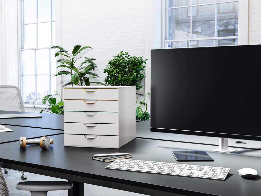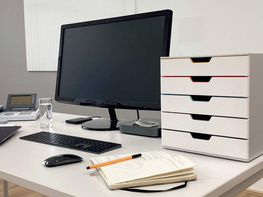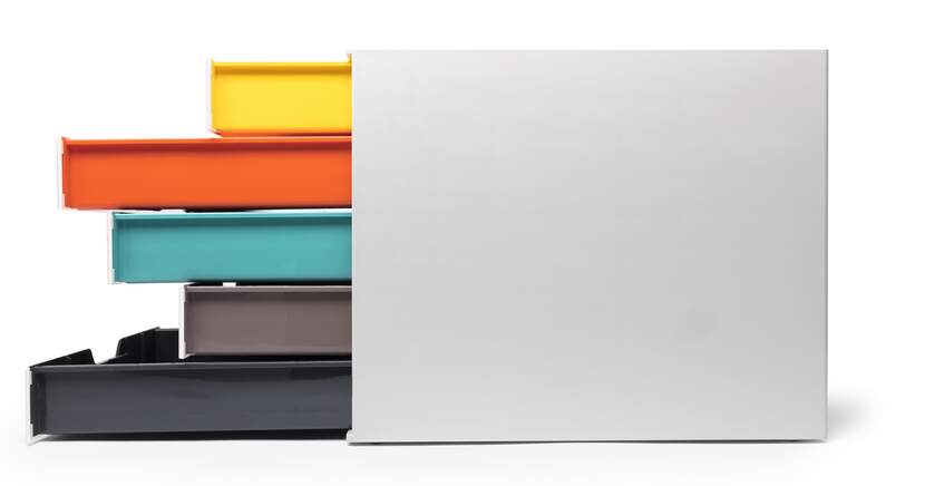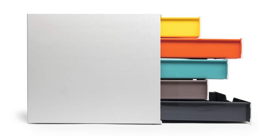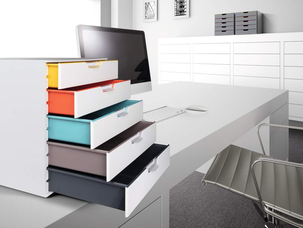• ponadczasowy, elegancki pojemnik z 5 kolorowymi szufladami umożliwiający segregację i łatwą orientację w dokumentach
