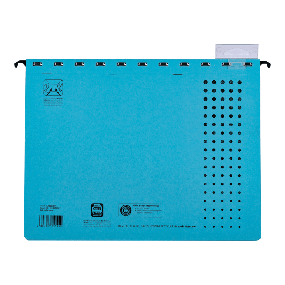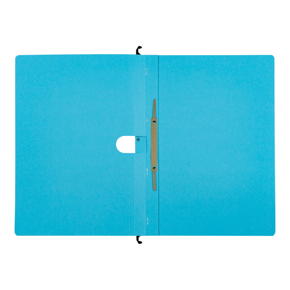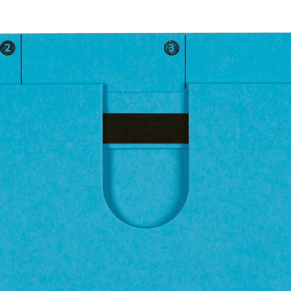 Skoroszyt zawieszkowy wykonany z mocnego kartonu. W zestawie przesuwny szyldzik z wymienną etykietą opisową. Wewnątrz metalowe zapięcie skoroszytowe, zabezpieczające dokumenty przed wypadaniem. Skoroszyt mieści do 220 kartek.