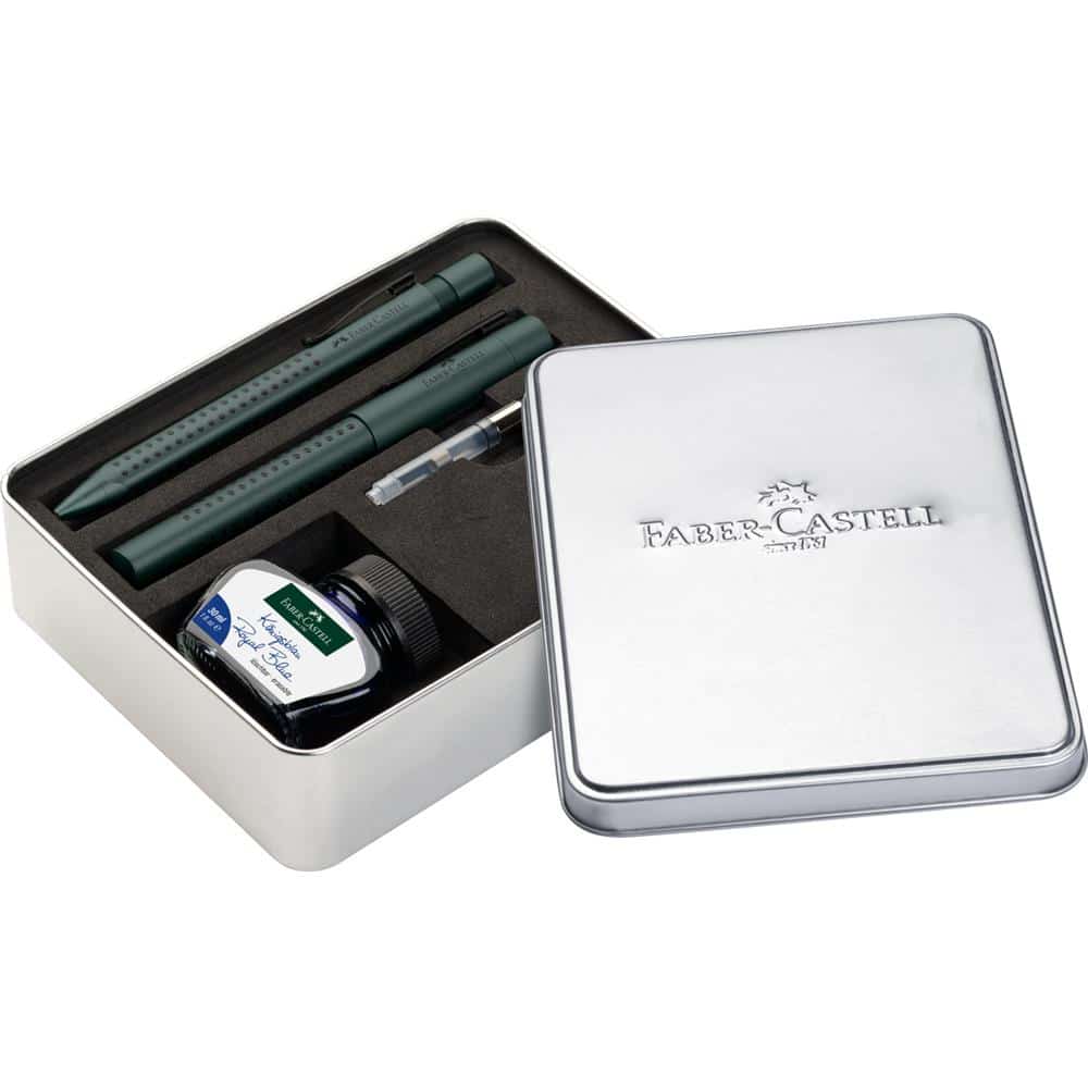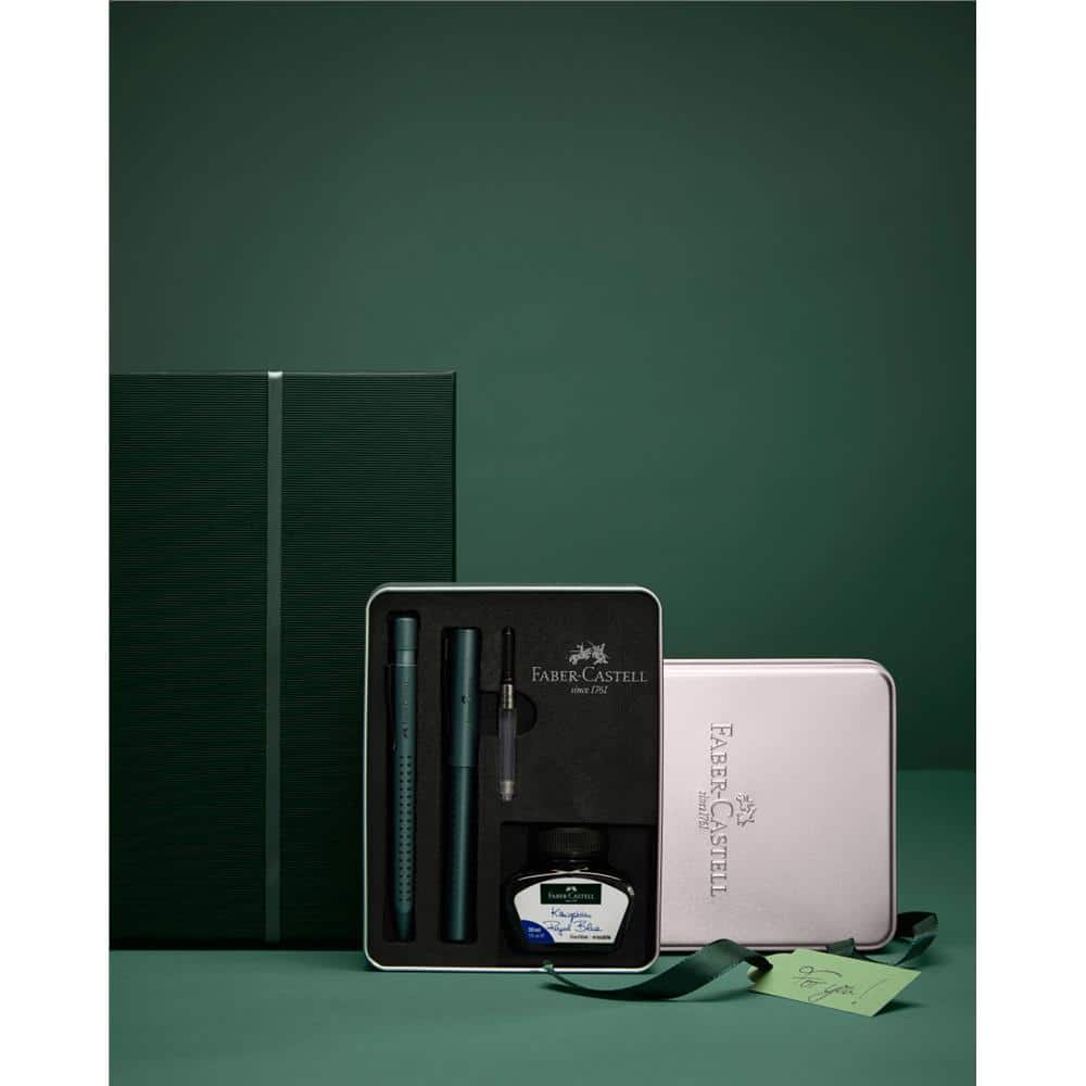 Zestaw prezentowy Faber-Castell z piórem wiecznym, konwerterem, atramentem 30 ml i długopisem z limitowanej edycji Grip 2011 w kolorze Mistletoe w metalowym, atrakcyjnym opakowaniu dopasowanym kolorystycznie do zawartości. Wyjątkowy i nowoczesny design z matowym wykończeniem. Zawiera: