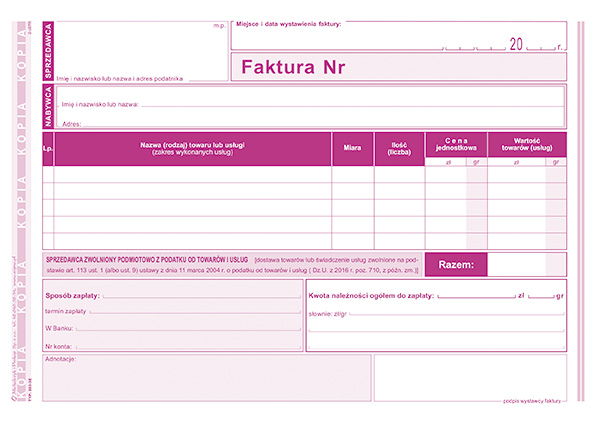 MICHALCZYK I PROKOP Faktura dla zwolnionych z podatku VAT – druk A5 poziomy 80 kartek samokopiujący (oryginał + kopia)