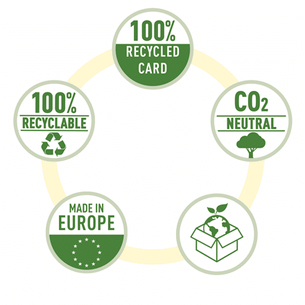 • Wykonana z kartonu w 100% pochodzącego z recyklingu (pokonsumpcyjnego), neutralna dla klimatu i w 100% nadająca się do ponownego przetworzenia (po zdjęciu gumki). Posiada certyfikat Blue Angel.