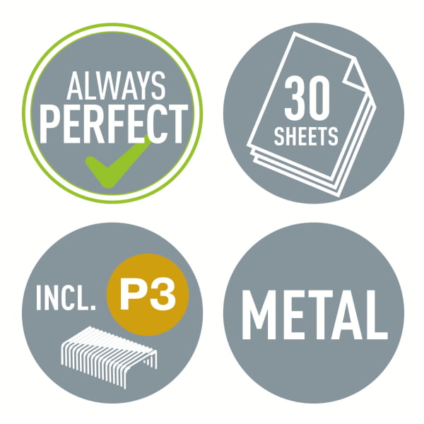 • Używany ze zszywkami Leitz Power Performance P3 24/6 i 26/6, opakowanie zszywek w komplecie.