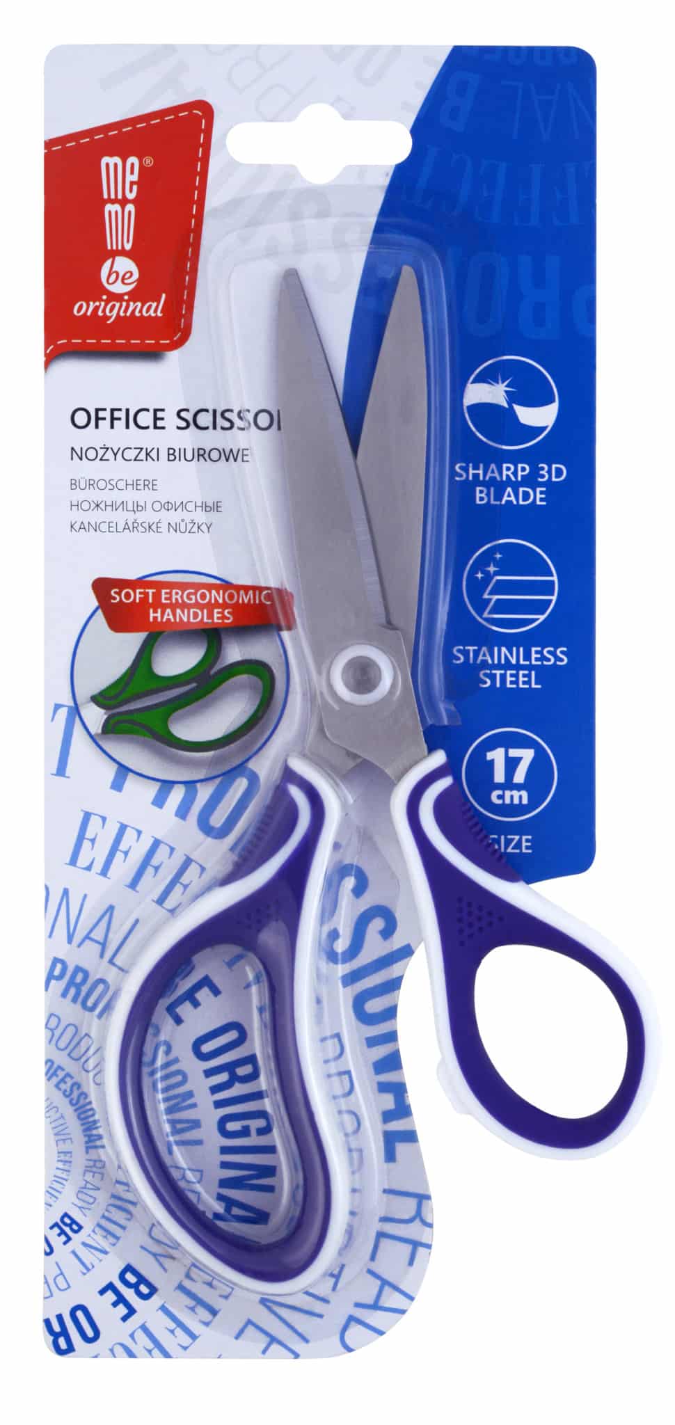 Nożyczki biurowo-szkolne MemoBe wykonane z wygodnego, miękkiego w dotyku tworzywa o długości 17cm. Posiadają specjalnie ostrze 3D ze stali nierdzewnej, które dzięki swojej konstrukcji i nachyleniu pod najbardziej optymalnym kątem, gwarantuje bardziej precyzyjne cięcie. Profilowana struktura stali zmniejsza tarcie między ostrzami, dzięki czemu nożyczki tną papier z większą łatwością.