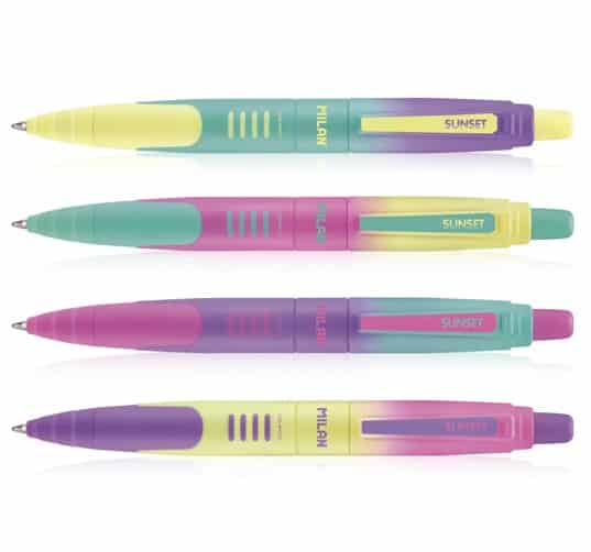 Długopisy niebieski COMPACT z kolekcji SUNSET z obudową w kolorach tęczy. Pstrykane. Przybliżona długość pisania: 1000 metrów. Końcówka 1 mm. Atrament wyprodukowany w Niemczech. Oryginalny produkt stworzony przez własny dział badawczo-rozwojowy MILAN. 4 różne kolory obudowy: żółty, fioletowy, różowy i turkusowy. Rozmiar długopisu: 14,1 x 1,7 cm x 1,4 cm.