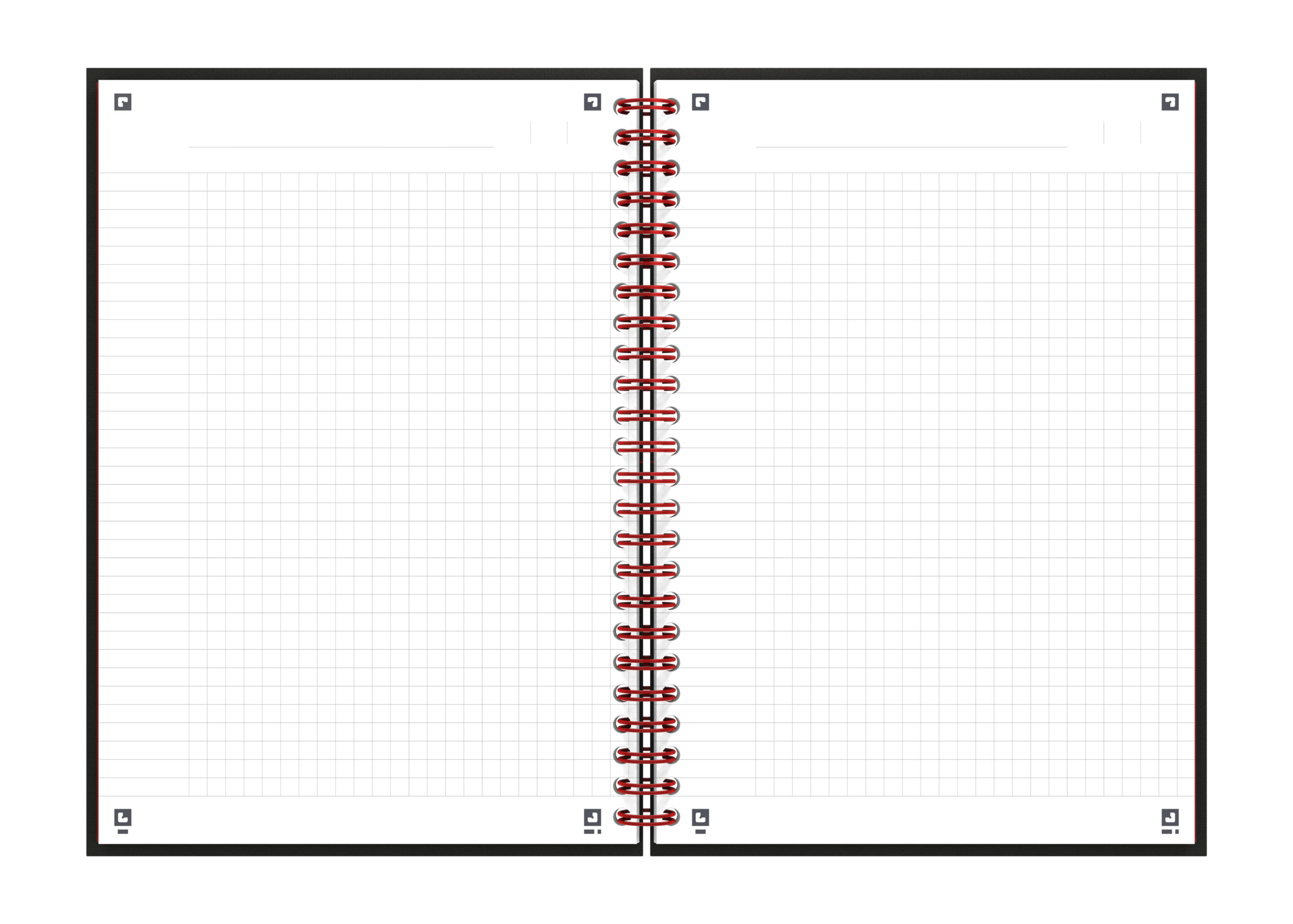 • Czerwona, podwójna spirala zapewnia, że notatnik leży perfekcyjnie płasko po otwarciu. Twarda kartonowa okładka chroni notatki przed zniszczeniem.
