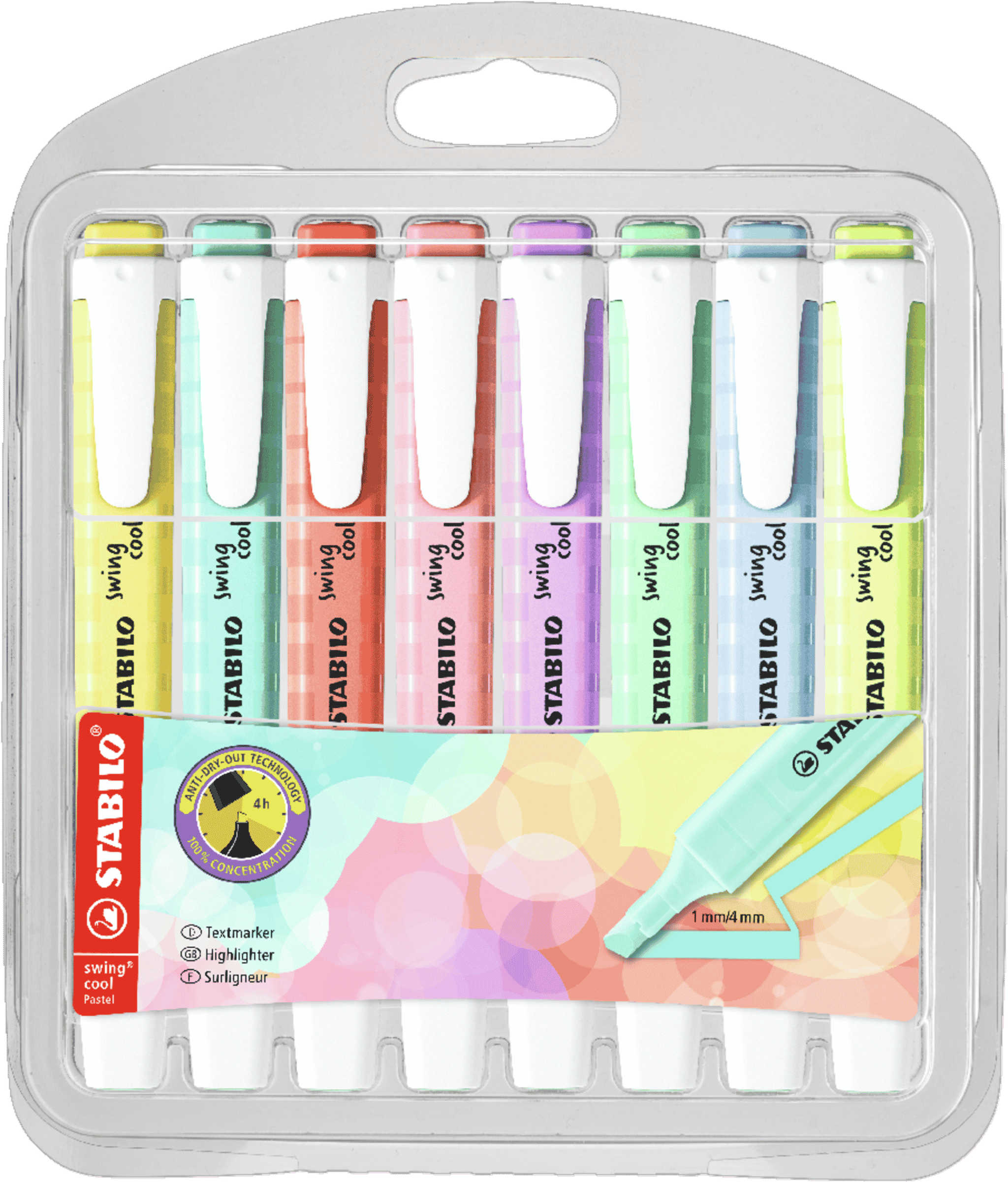 STABILO swing cool Pastel – zakreślacz dla dzieci, młodzieży i osób które podróżują w modnych, pastelowych tonacjach. Kieszonkowy format zakreślacza z praktycznym klipsem do zaczepiania sprawia, że nie zajmuje dużo miejsca więc można go zawsze mieć przy sobie (w torbie, piórniku, kieszeni). Technologia Anti-Dry-Out sprawia, że pozostawiony bez skuwki nawet prze 4 godziny nie zasycha. Grubość linii 1-4 mm.