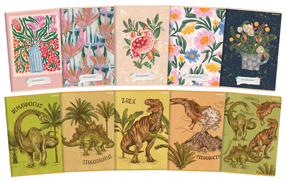 Kolekcja zeszytów inspirowana światem dinozaurów i domowymi kwiatami – łączy w sobie 2 zupełnie różne style ilustracji. 5 okładek przedstawia ryciny z wizerunkami i nazwami dinozaurów na tle elementów natury. Kolejne 5 to abstrakcyjne kwiaty w postaci wzorów lub umieszczone w wazonach. Wszystkie ilustracje zostały indywidualnie zaprojektowane, dzięki czemu są niepowtarzalne i jedyne w swoim rodzaju. Znajdź swoją ulubioną okładkę z kolekcji Dino Spring i wyróżnij się w klasie!
